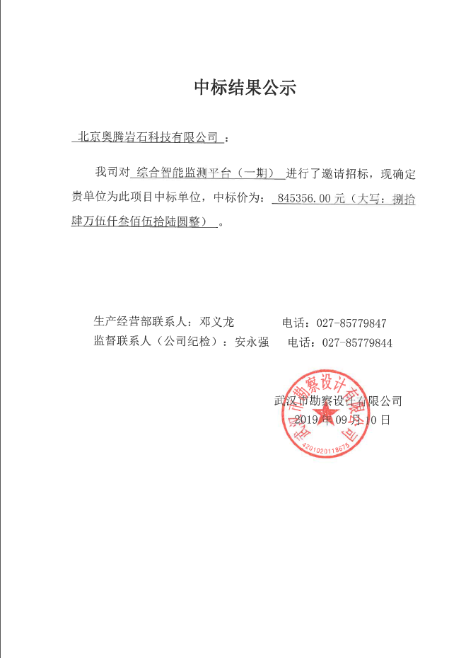 武漢市勘察設(shè)計有限公司綜合智能監(jiān)測平臺(一期)中標結(jié)果公示