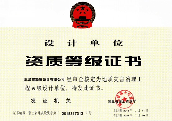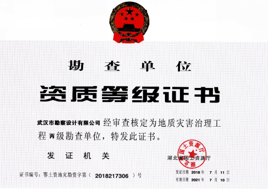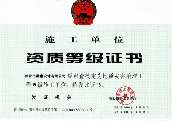 近日,湖北省國(guó)土資源廳發(fā)布了關(guān)于2018年度地質(zhì)災(zāi)害危險(xiǎn)性評(píng)估和治理工程資質(zhì)(新立、升級(jí))審批結(jié)果的公告,公司地質(zhì)災(zāi)害危險(xiǎn)性評(píng)估和地質(zhì)災(zāi)害治理工程勘查、設(shè)計(jì)、施工資質(zhì)申請(qǐng)一次性順利通過國(guó)土資源部審核,并成功取得了資質(zhì)證書。